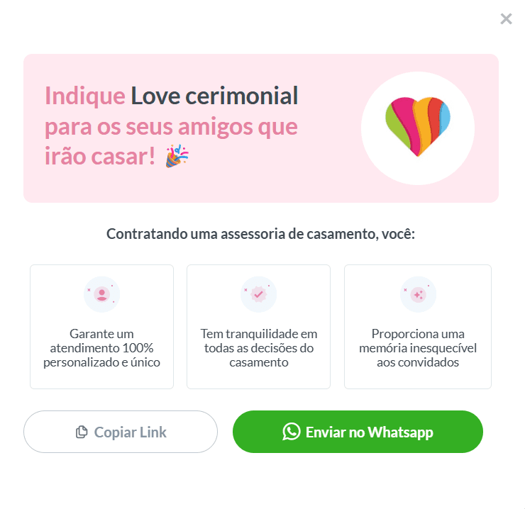 • Após a data do casamento, inclusão de um modal para indicar a assessoria via WhatsApp.